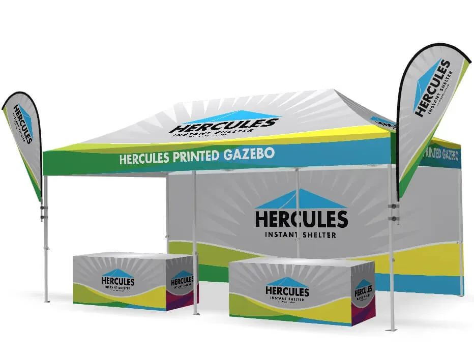 Hercules custom-printed gazebos are made from durable, weatherproof materials, including water-resistant and UV-resistant fabrics. These materials ensure long-lasting outdoor use while maintaining vibrant prints.