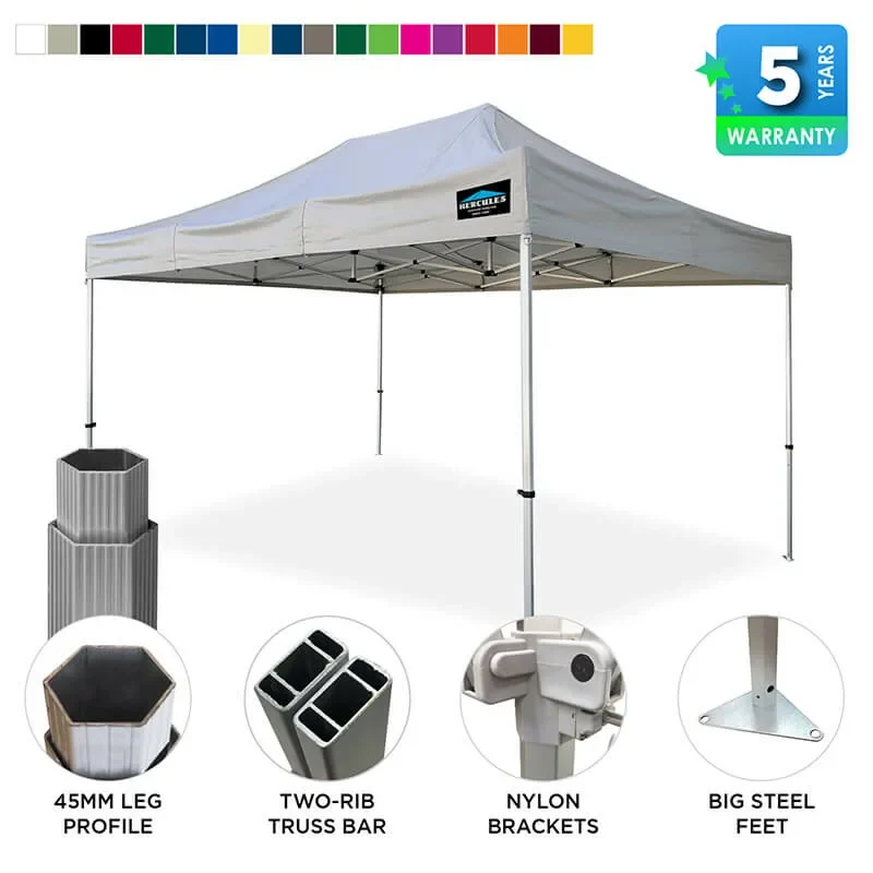 Discover our Hercules gazebos in different sizes, featuring the popular 3×4.5 pop up gazebo. Tailor your choice with varied gazebo strengths, colours, and side options. Explore our diverse 4.5×3 gazebo range today to meet your specific needs.
