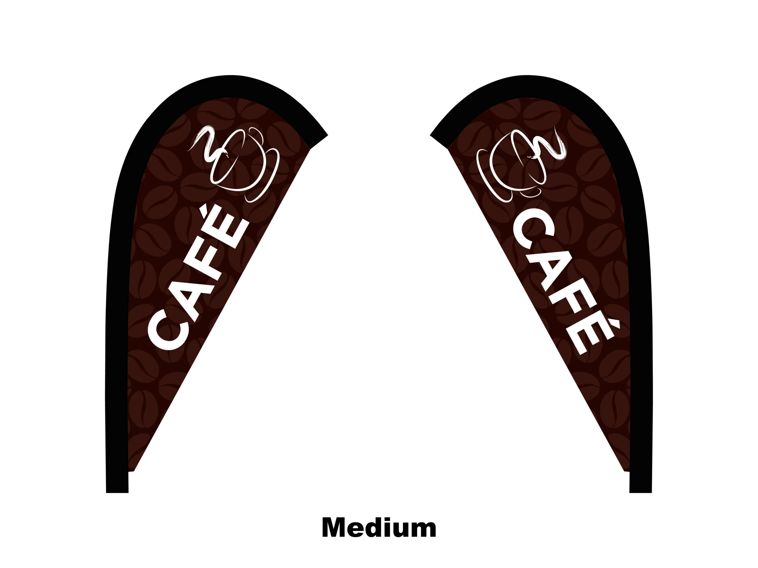 Our pre-designed café teardrop flags are made to grab attention, with vibrant graphics and durable materials. Available in various sizes and six base options, they’re perfect for indoor or outdoor use, and great for attracting customers with ease. We also offer café flags in other shapes—please check our other listings for more options, or create your own, custom print with your logo and design. For custom options, please visit our custom flag banner page.