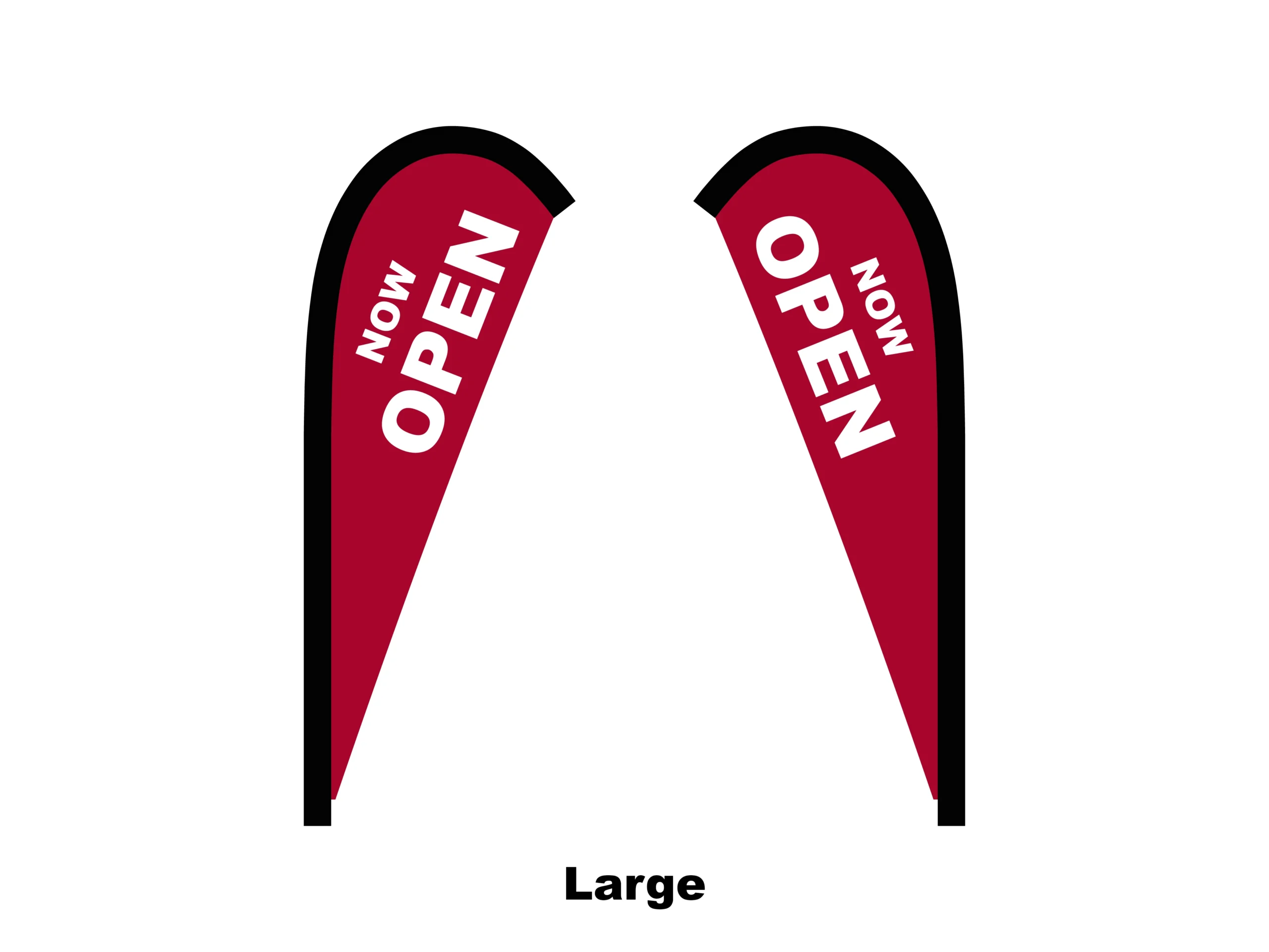 • “NOW OPEN” Teardrop flag sign, 250 GSM with Double-sided printing (background colour: Red PMS 207C)